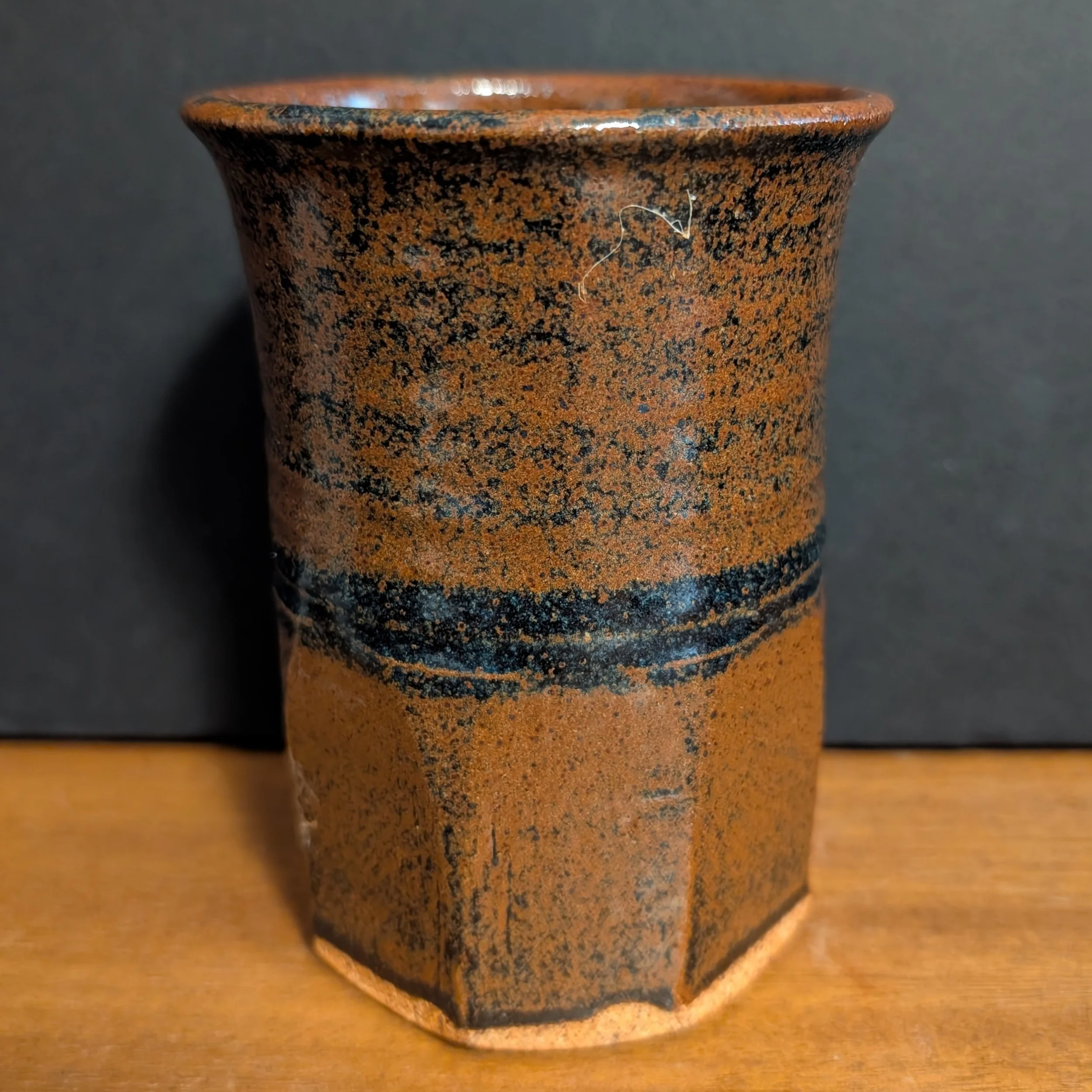Set of four artisan hand-thrown tumblers crafted from rich brown stoneware with subtle black glaze accents. Their elegant, sculptural shape combines a gently flared rim with a smooth upper portion that transitions into a faceted lower half.