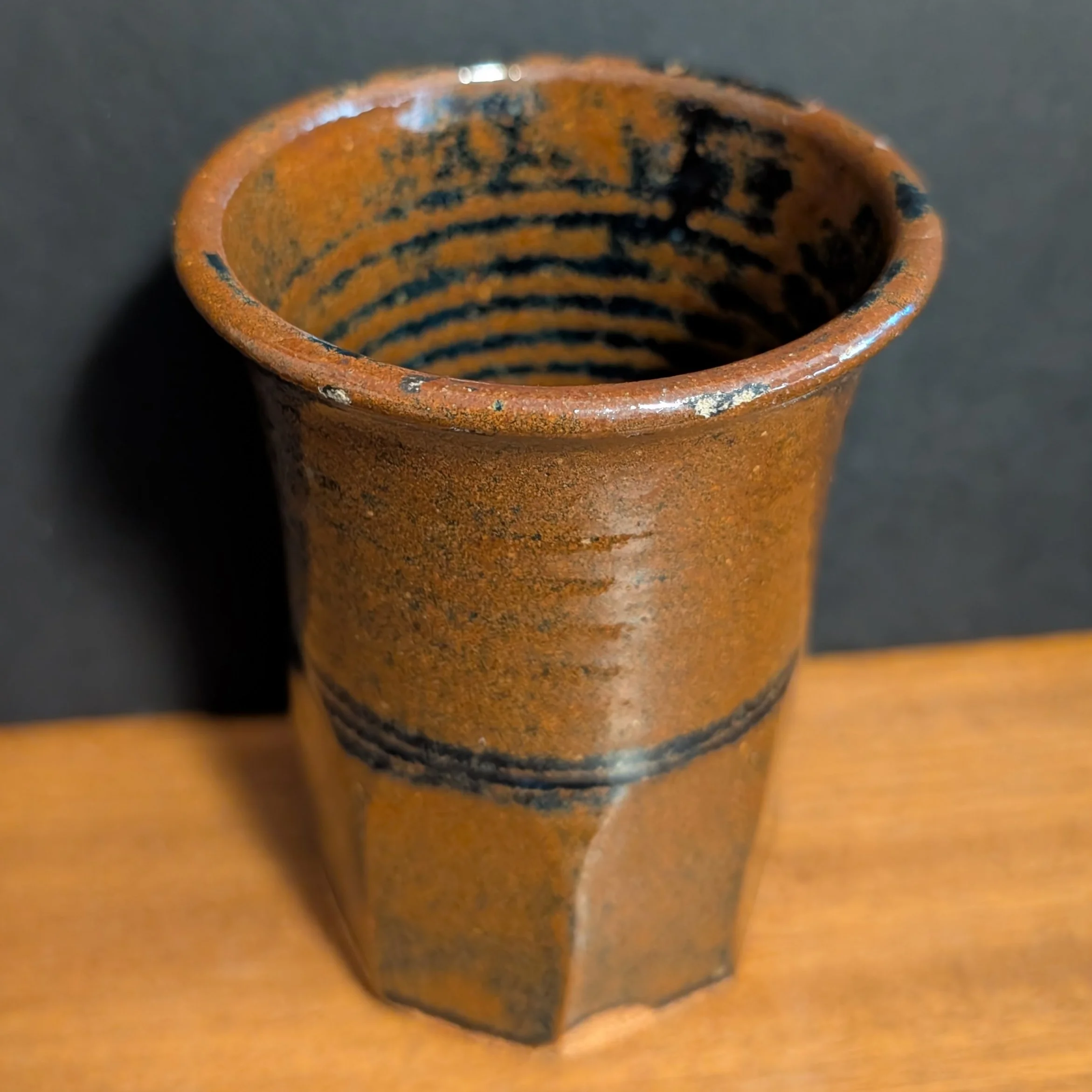 The set is in good vintage condition. There are a few small chips along the rim (see individual photos for detail), and one tumbler has a light surface scratch on the side. These minor imperfections do not affect function or overall appeal. Typical variations from the hand‑thrown process and minor kiln marks from production are present. There are otherwise no cracks or structural issues.